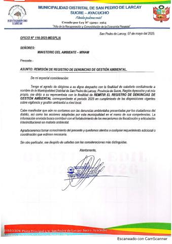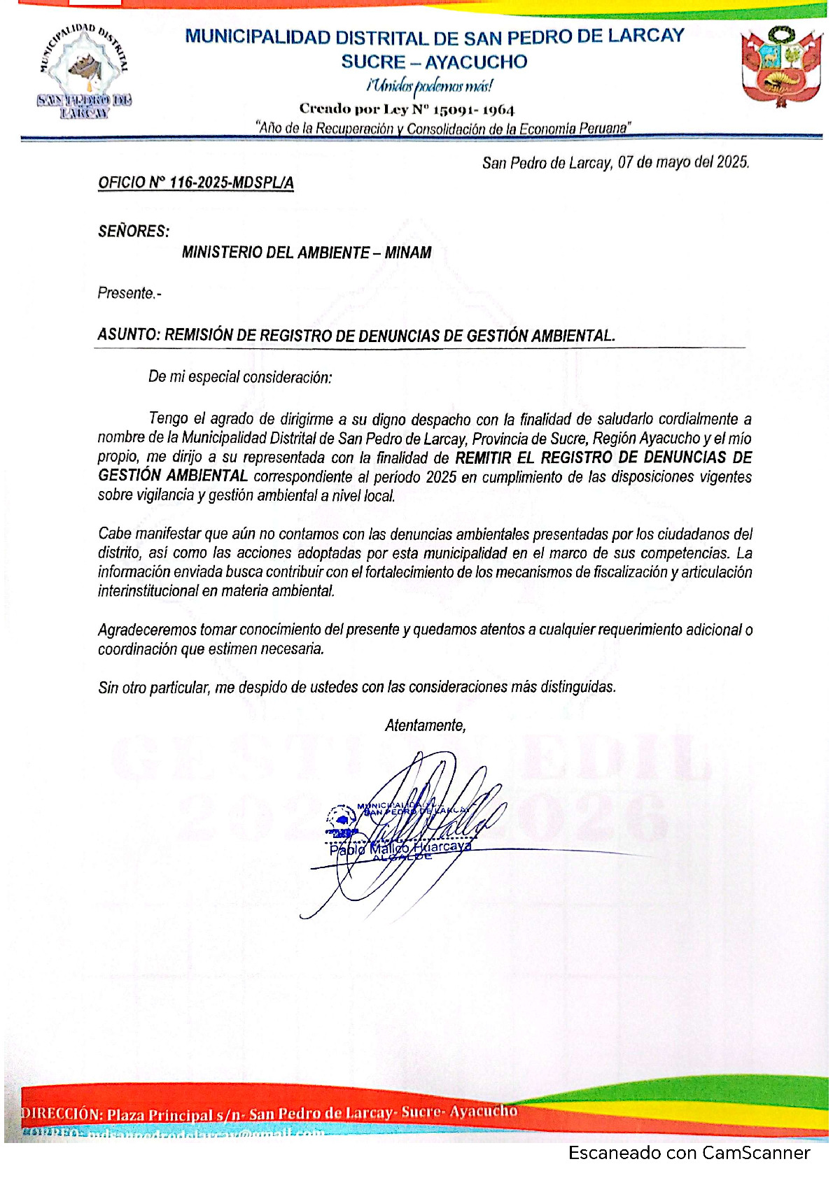 Informe sobre reporte de denuncias ambiental es anuales 2024 Municipalidad Distrital de San Pedro de Larcay