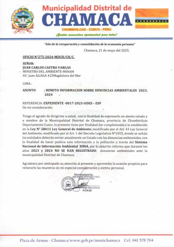 Informe sobre reporte de denuncias ambiental es anuales 2024 Municipalidad Distrital de Chamaca
