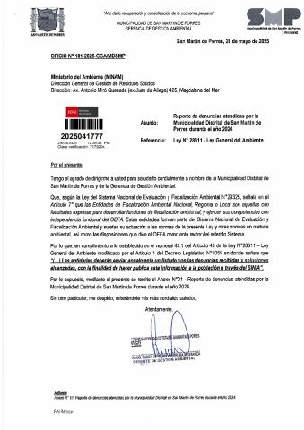 En cumplimiento de lo establecido en el Decreto Legislativo N° 1055 que modifica el artículo 43° de la Ley N° 28611, que indica que "Las entidades deberán enviar anualmente un listado con las denuncias recibidas y soluciones alcanzadas, con la finalidad de hacer pública esta información a la población a través del SINIA".