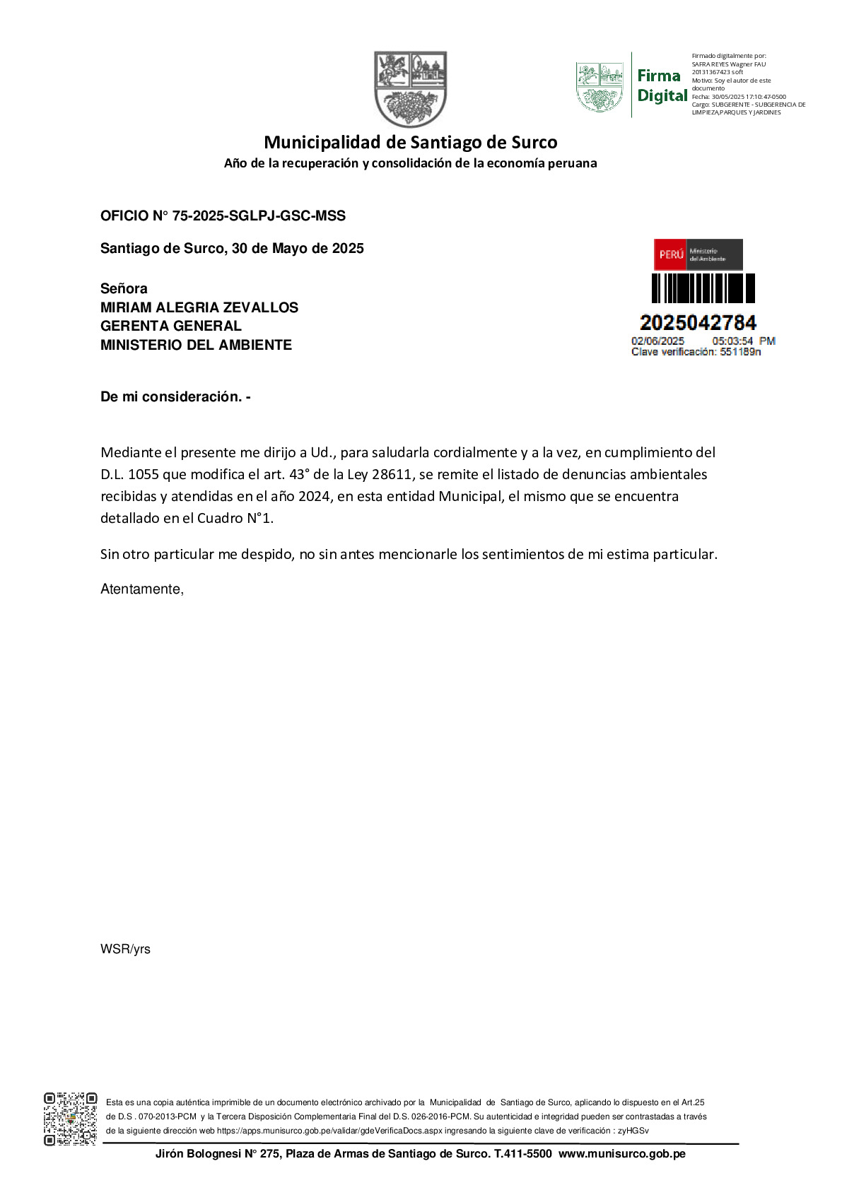 Informe sobre reporte de denuncias ambiental es anuales 2024 Municipalidad Distrital de Surco