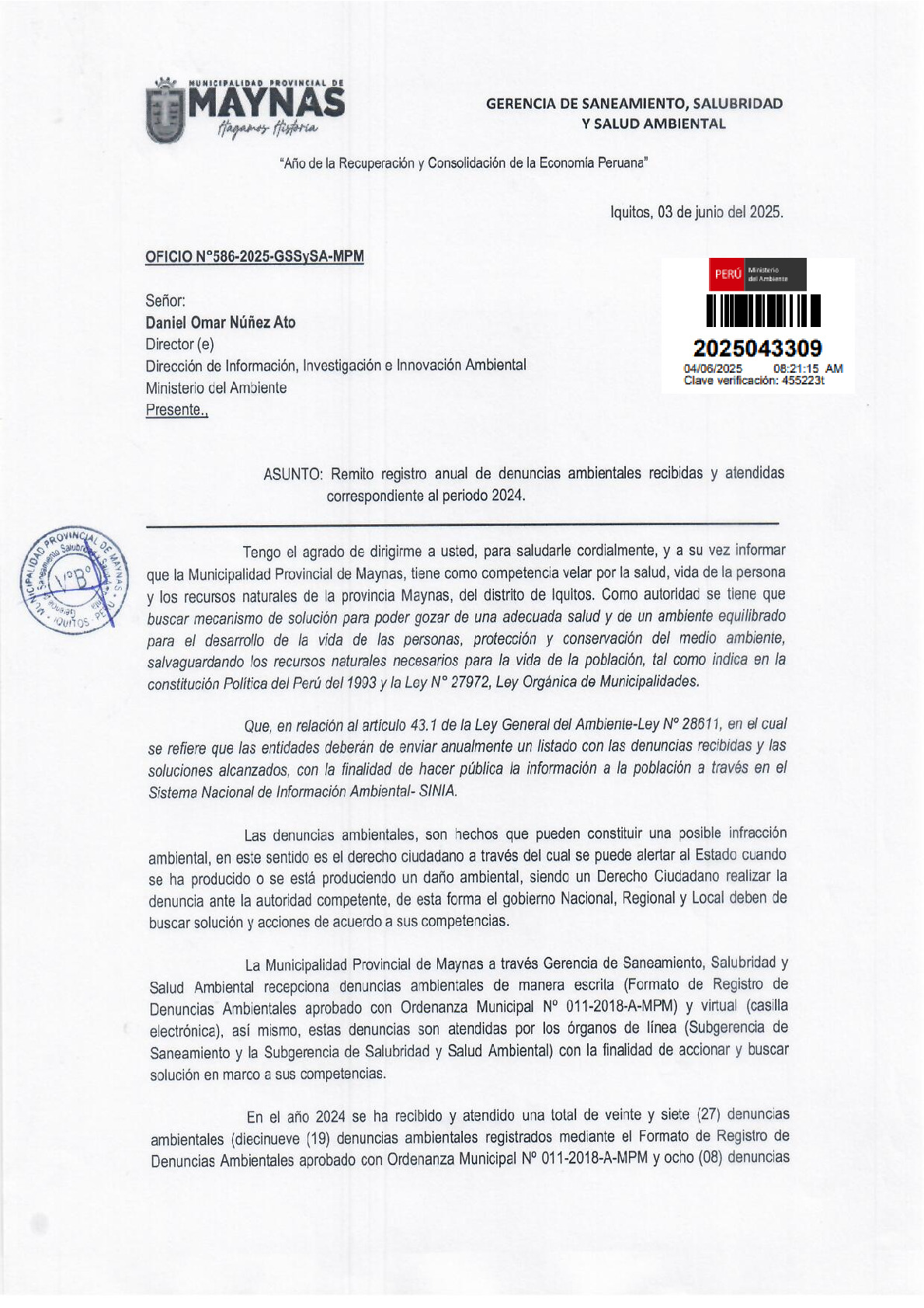 Informe sobre reporte de denuncias ambiental es anuales 2024 Municipalidad Provincial de Maynas