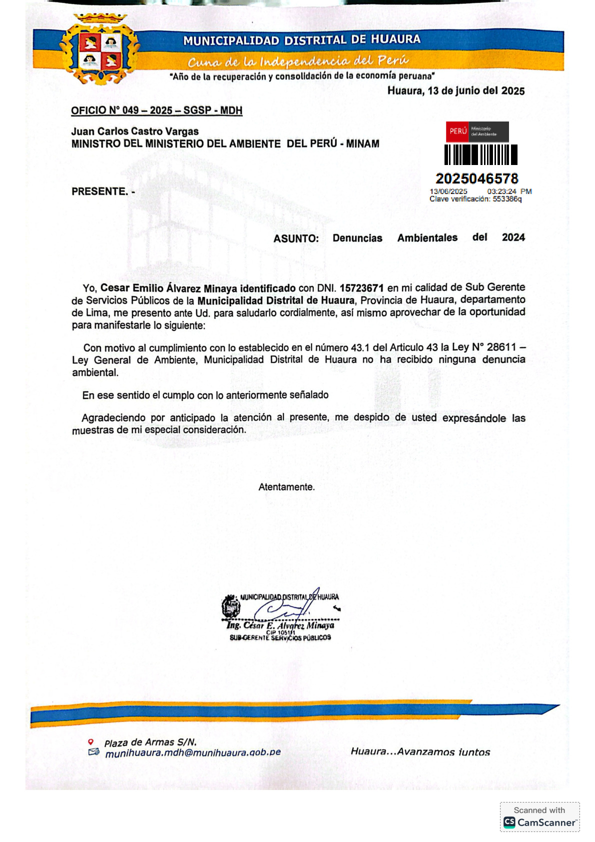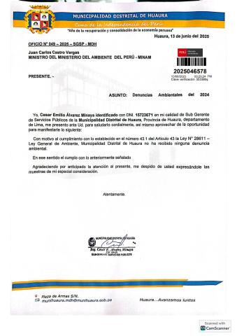 Informe sobre reporte de denuncias ambiental es anuales 2024 Municipalidad Distrital de Huaura