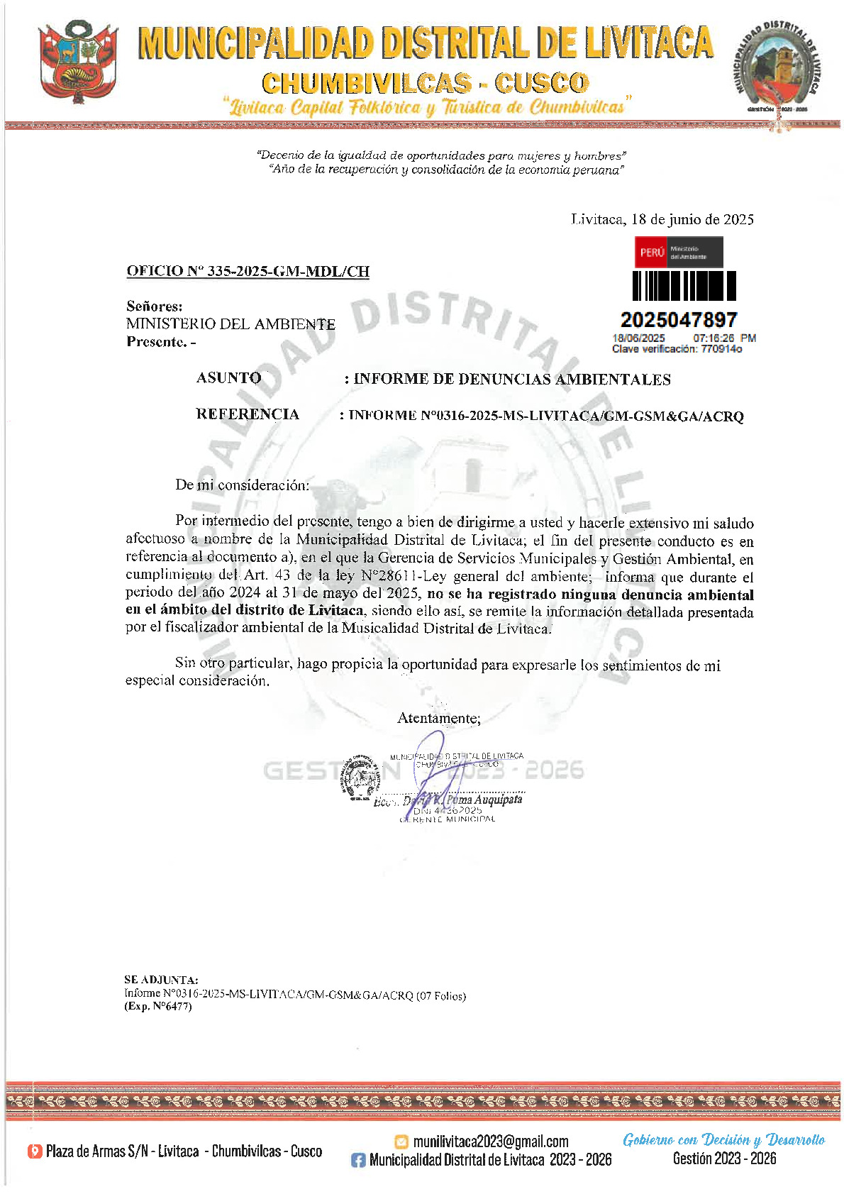 Informe sobre reporte de denuncias ambiental es anuales 2024 Municipalidad Distrital de Livitaca