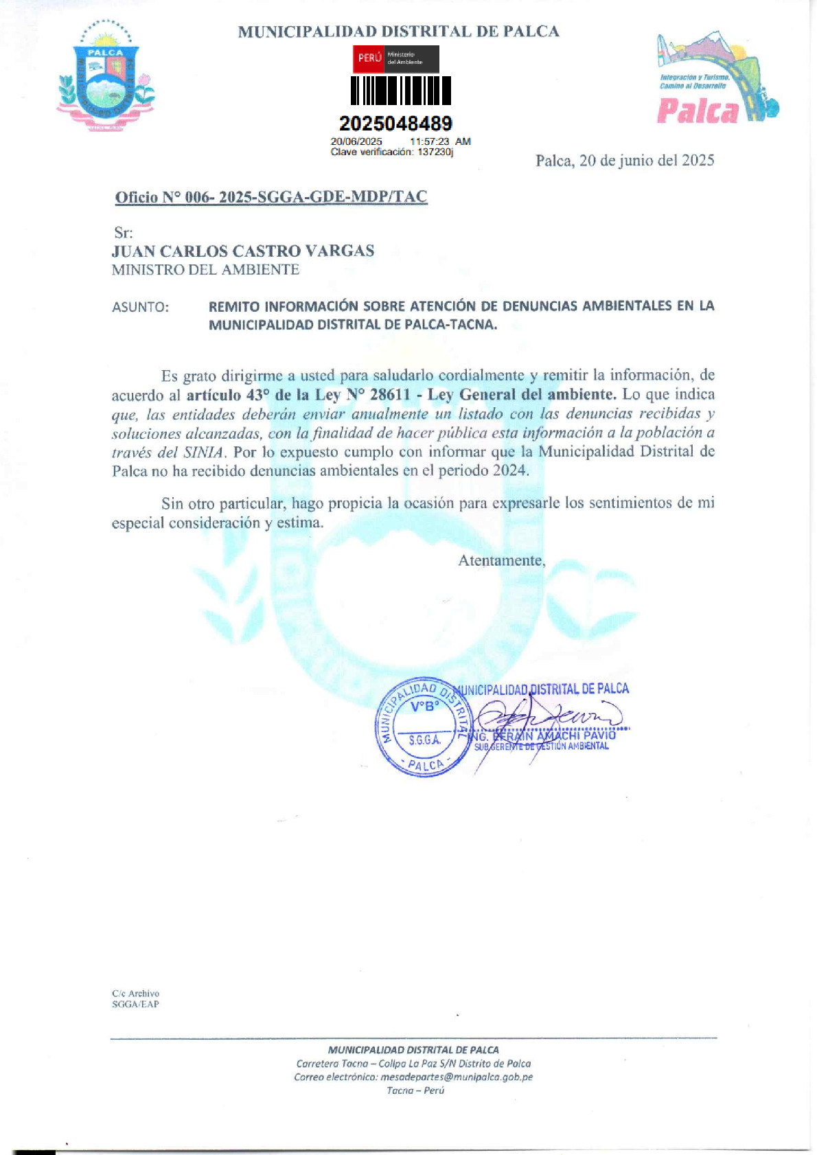 Informe sobre reporte de denuncias ambiental es anuales 2024 Municipalidad Distrital de Palca