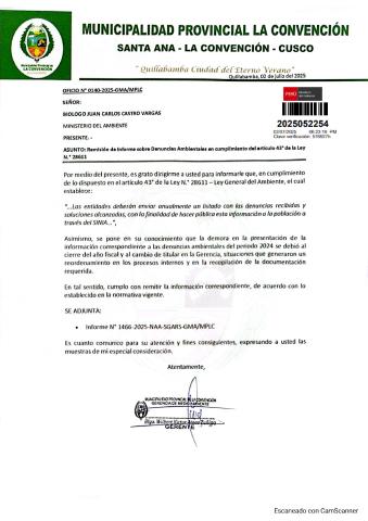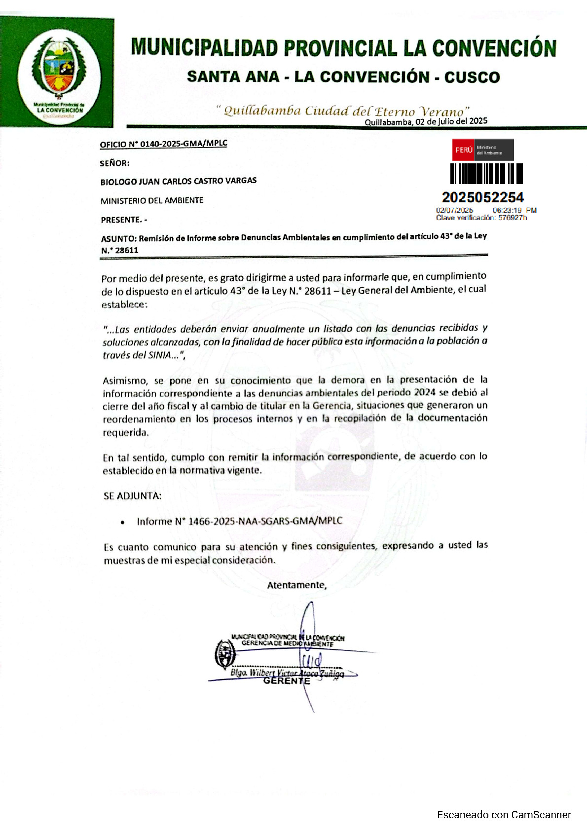 En cumplimiento de lo establecido en el Decreto Legislativo N° 1055 que modifica el artículo 43° de la Ley N° 28611, que indica que "Las entidades deberán enviar anualmente un listado con las denuncias recibidas y soluciones alcanzadas, con la finalidad de hacer pública esta información a la población a través del SINIA".
