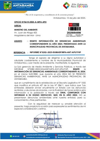 Informe sobre reporte de denuncias ambiental es anuales 2024 Municipalidad Distrital de Antabamba