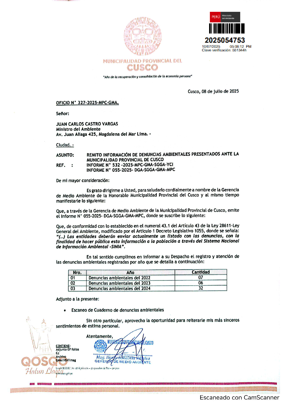 Informe sobre reporte de denuncias ambiental es anuales 2024 Municipalidad Provincial del Cusco
