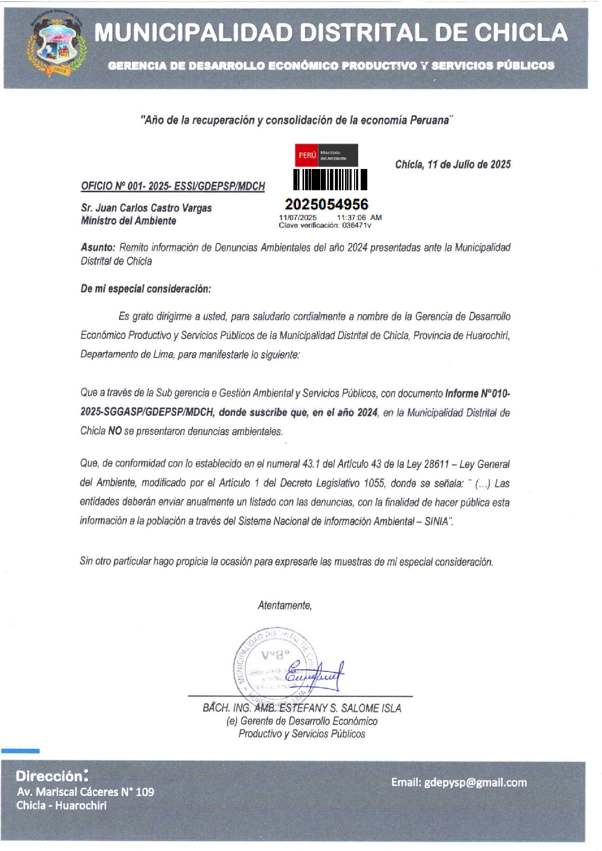 Informe sobre reporte de denuncias ambiental es anuales 2024 Municipalidad Distrital de Chicla
