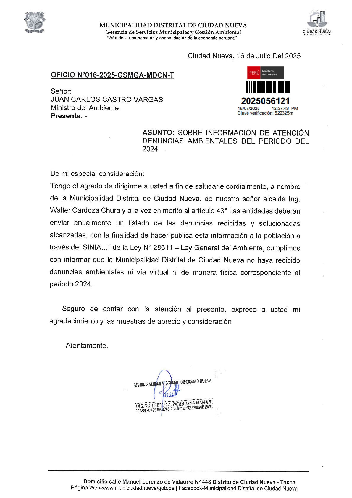 En cumplimiento de lo establecido en el Decreto Legislativo N° 1055 que modifica el artículo 43° de la Ley N° 28611, que indica que "Las entidades deberán enviar anualmente un listado con las denuncias recibidas y soluciones alcanzadas, con la finalidad de hacer pública esta información a la población a través del SINIA".