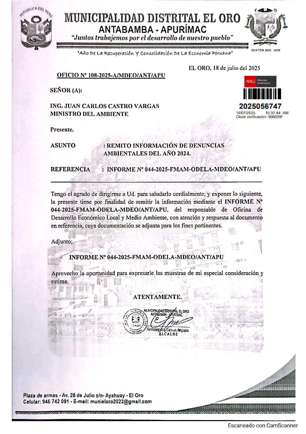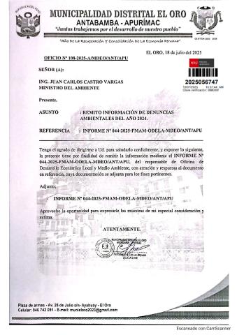Informe sobre reporte de denuncias ambiental es anuales 2024 Municipalidad Distrital de el Oro