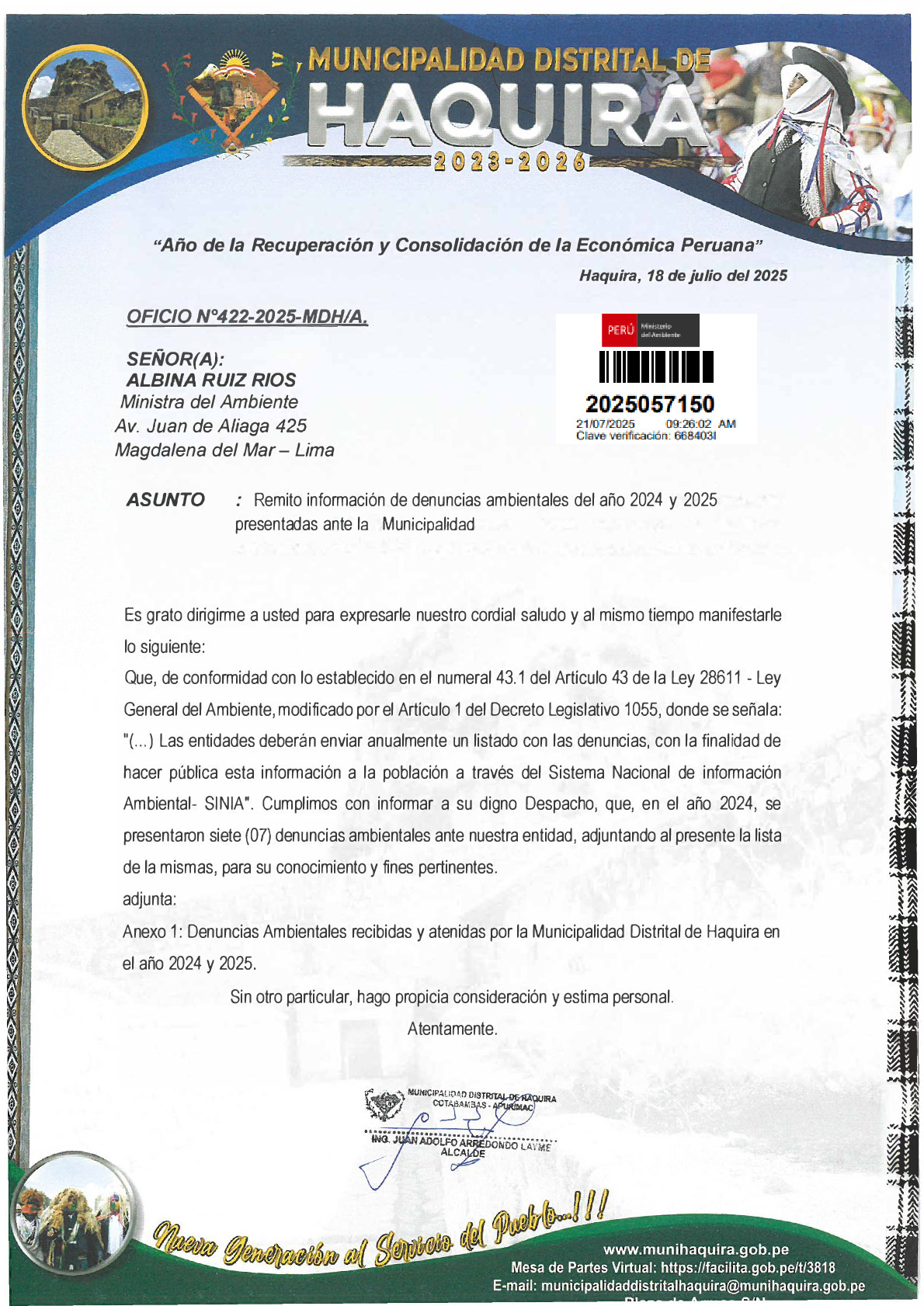 Informe sobre reporte de denuncias ambiental es anuales 2024 Municipalidad Distrital de Haquira