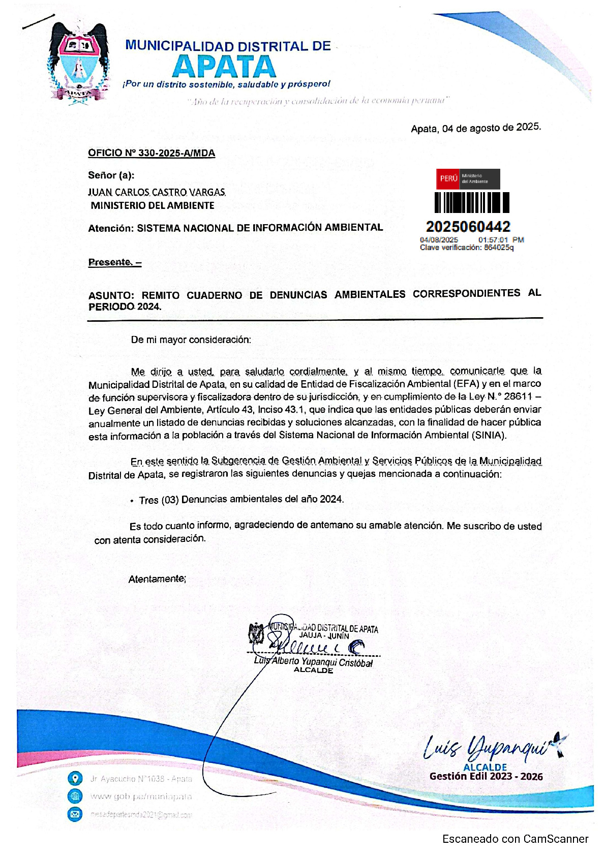 Informe sobre reporte de denuncias ambiental es anuales 2024 Municipalidad Distrital de Apata