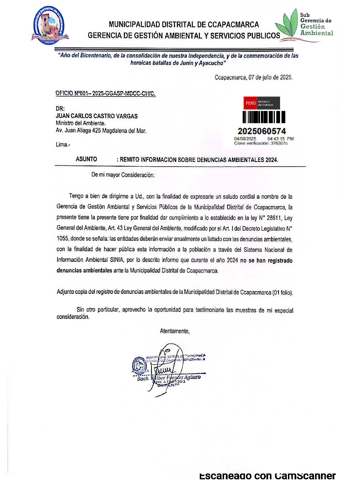 Informe sobre reporte de denuncias ambiental es anuales 2024 Municipalidad Distrital de Ccapacmarca