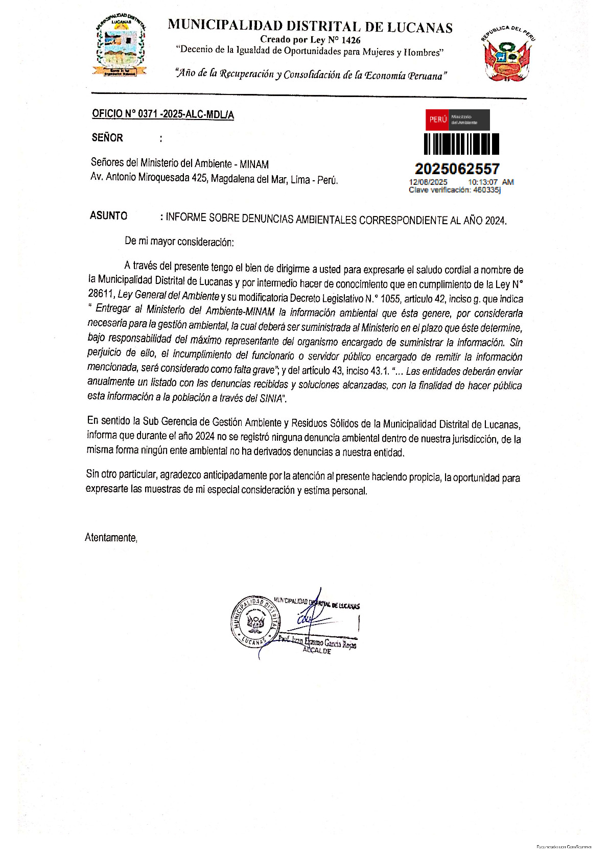 Informe sobre reporte de denuncias ambiental es anuales 2024 Municipalidad Distrital de Lucanas