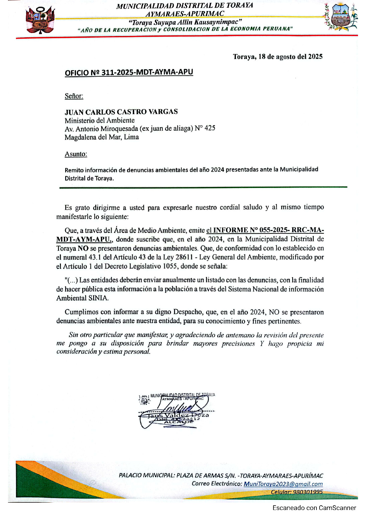 Informe sobre reporte de denuncias ambiental es anuales 2024 Municipalidad Distrital de Toraya