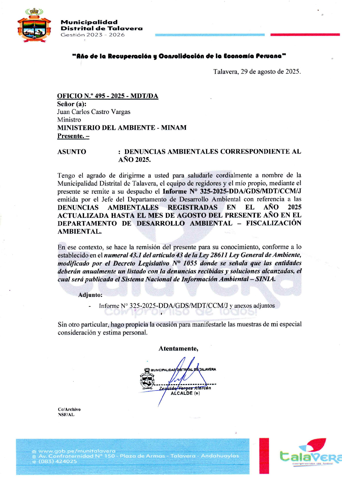 Informe sobre reporte de denuncias ambiental es anuales 2024 Municipalidad Distrital de Talavera