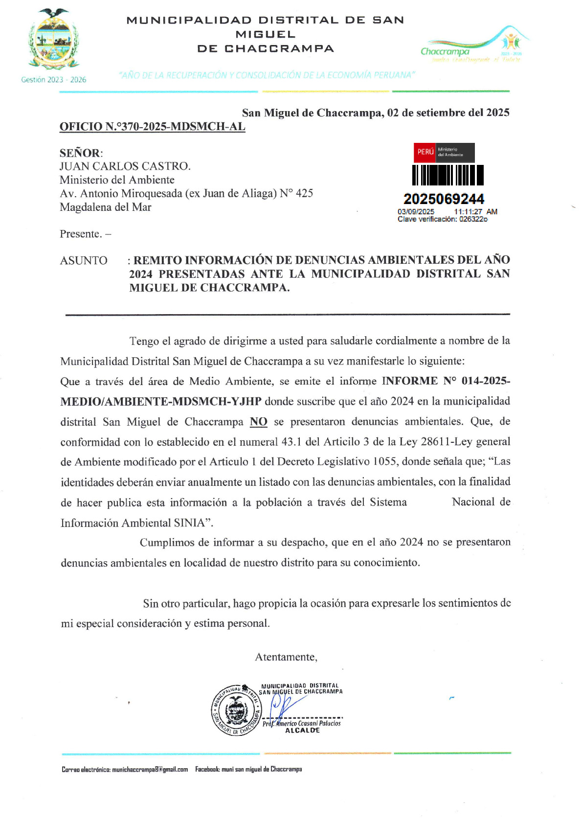 Informe sobre reporte de denuncias ambiental es anuales 2024 Municipalidad Distrital de San Miguel de Chaccrampa
