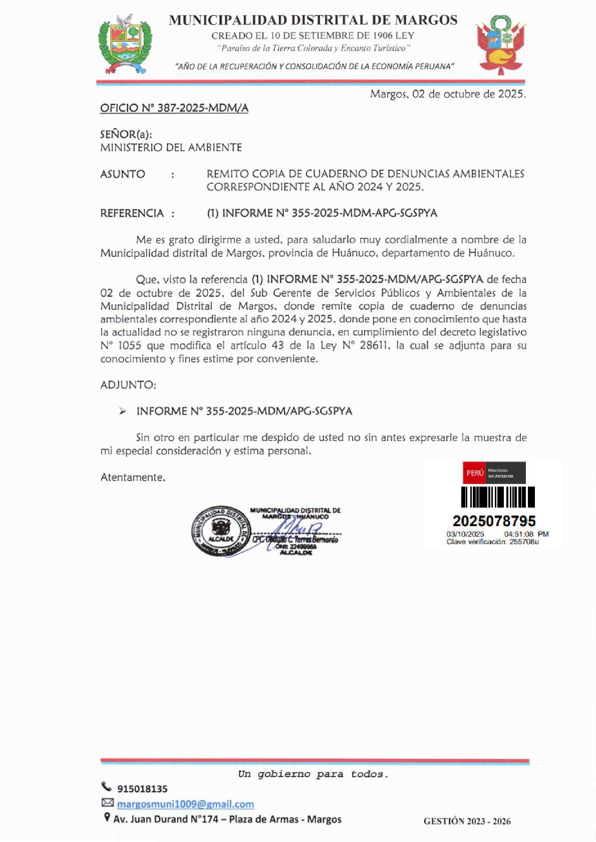 Informe sobre reporte de denuncias ambiental es anuales 2024 Municipalidad Distrital de Margos