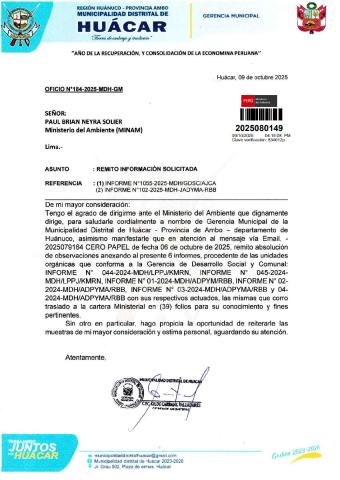 Informe sobre reporte de denuncias ambiental es anuales 2024 Municipalidad Distrital de Huacar