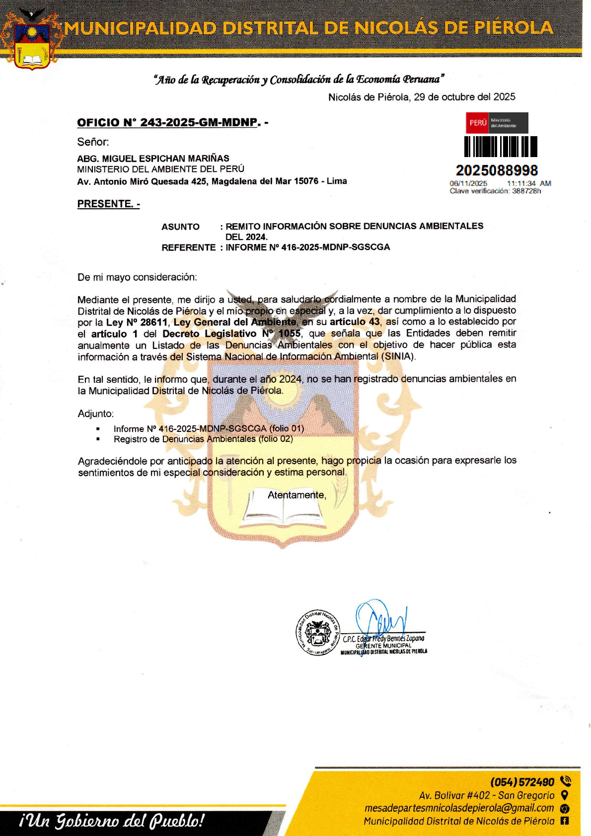 Informe sobre reporte de denuncias ambiental es anuales 2024 Municipalidad Distrital de Nicolas de Pierola
