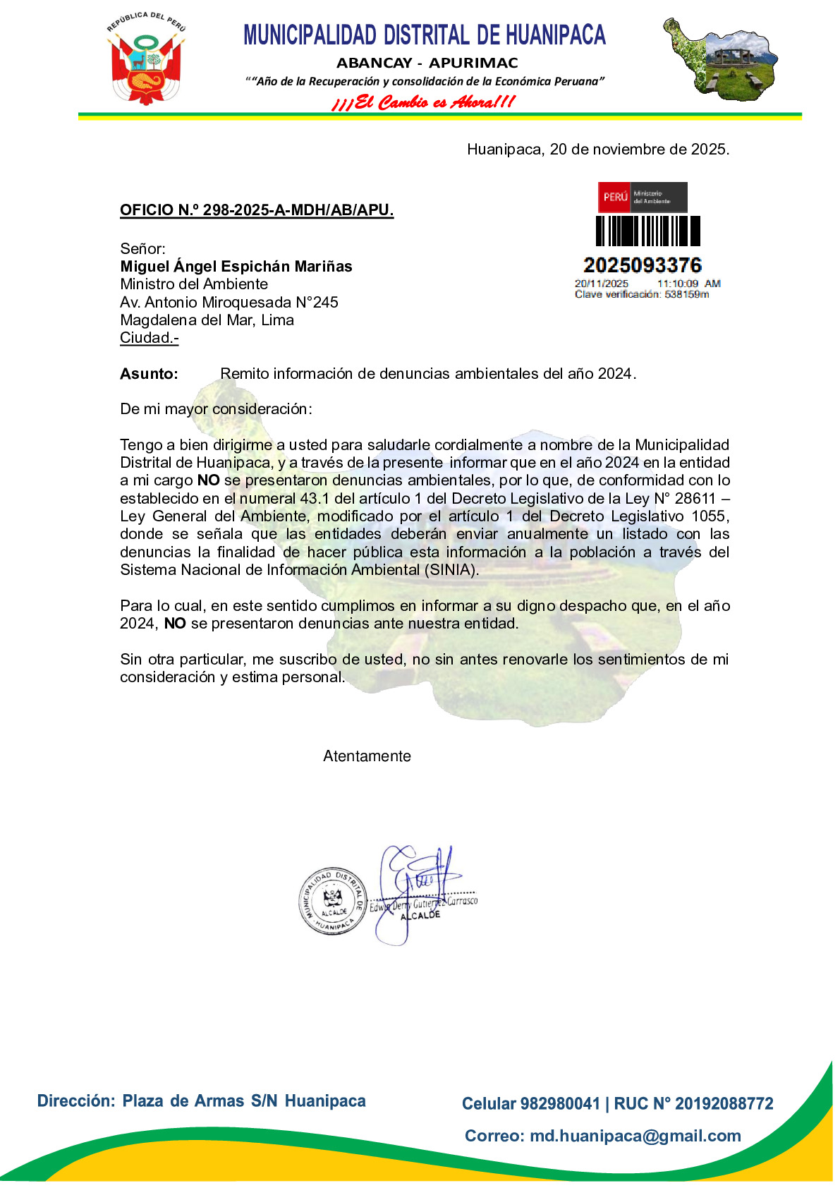 Informe sobre reporte de denuncias ambiental es anuales 2024 Municipalidad Distrital de Huanipaca