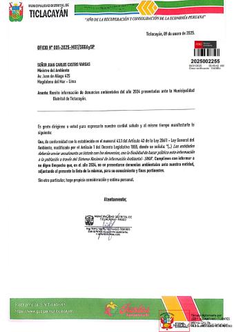 Informe sobre reporte de denuncias ambiental es anuales 2024 Municipalidad Distrital de Ticlacayan