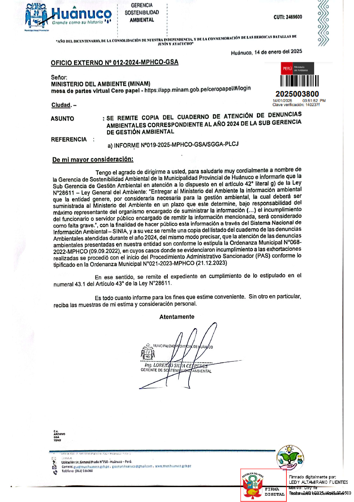 Informe sobre reporte de denuncias ambiental es anuales 2024 Municipalidad Provincial de Huanuco