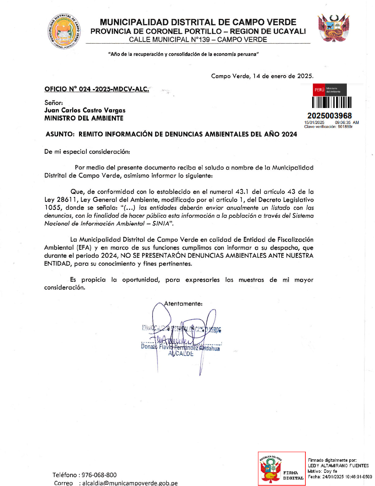 Informe sobre reporte de denuncias ambiental es anuales 2024 Municipalidad Distrital de Campo Verde