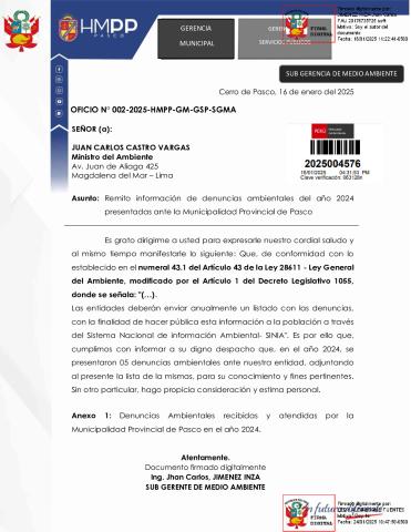 Informe sobre reporte de denuncias ambiental es anuales 2024 Municipalidad Provincial de Pasco