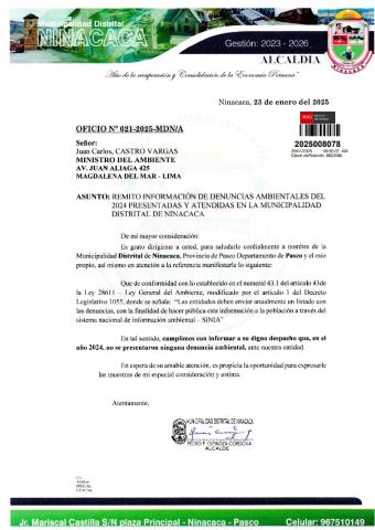 Informe sobre reporte de denuncias ambiental es anuales 2024 Municipalidad Distrital de Ninacaca