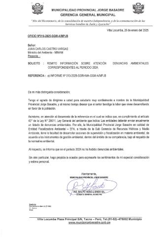 Informe sobre reporte de denuncias ambiental es anuales 2024 Municipalidad Provincial de Jorge Basadre