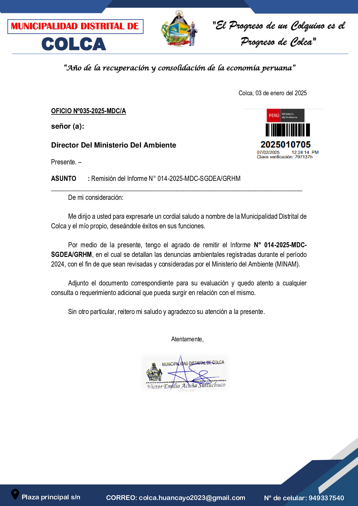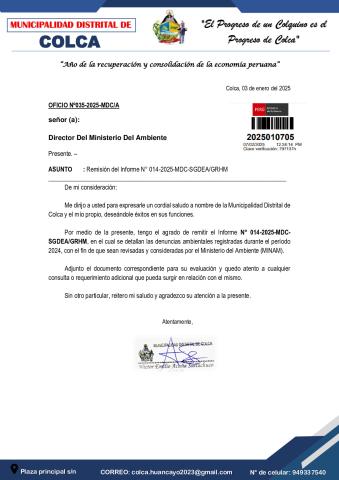 Informe sobre reporte de denuncias ambiental es anuales 2024 Municipalidad Distrital de Colca