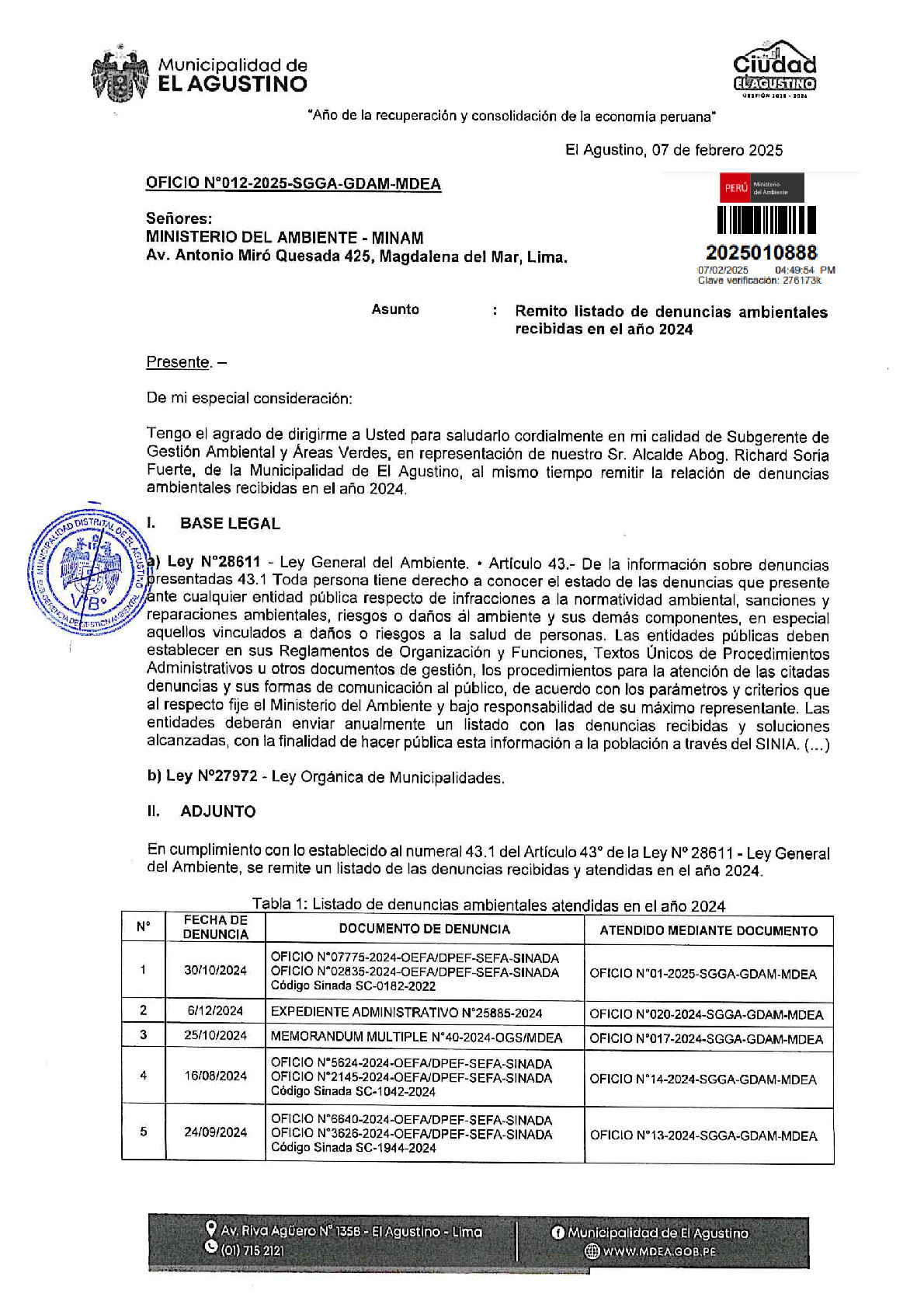 En cumplimiento de lo establecido en el Decreto Legislativo N° 1055 que modifica el artículo 43° de la Ley N° 28611, que indica que "Las entidades deberán enviar anualmente un listado con las denuncias recibidas y soluciones alcanzadas, con la finalidad de hacer pública esta información a la población a través del SINIA".