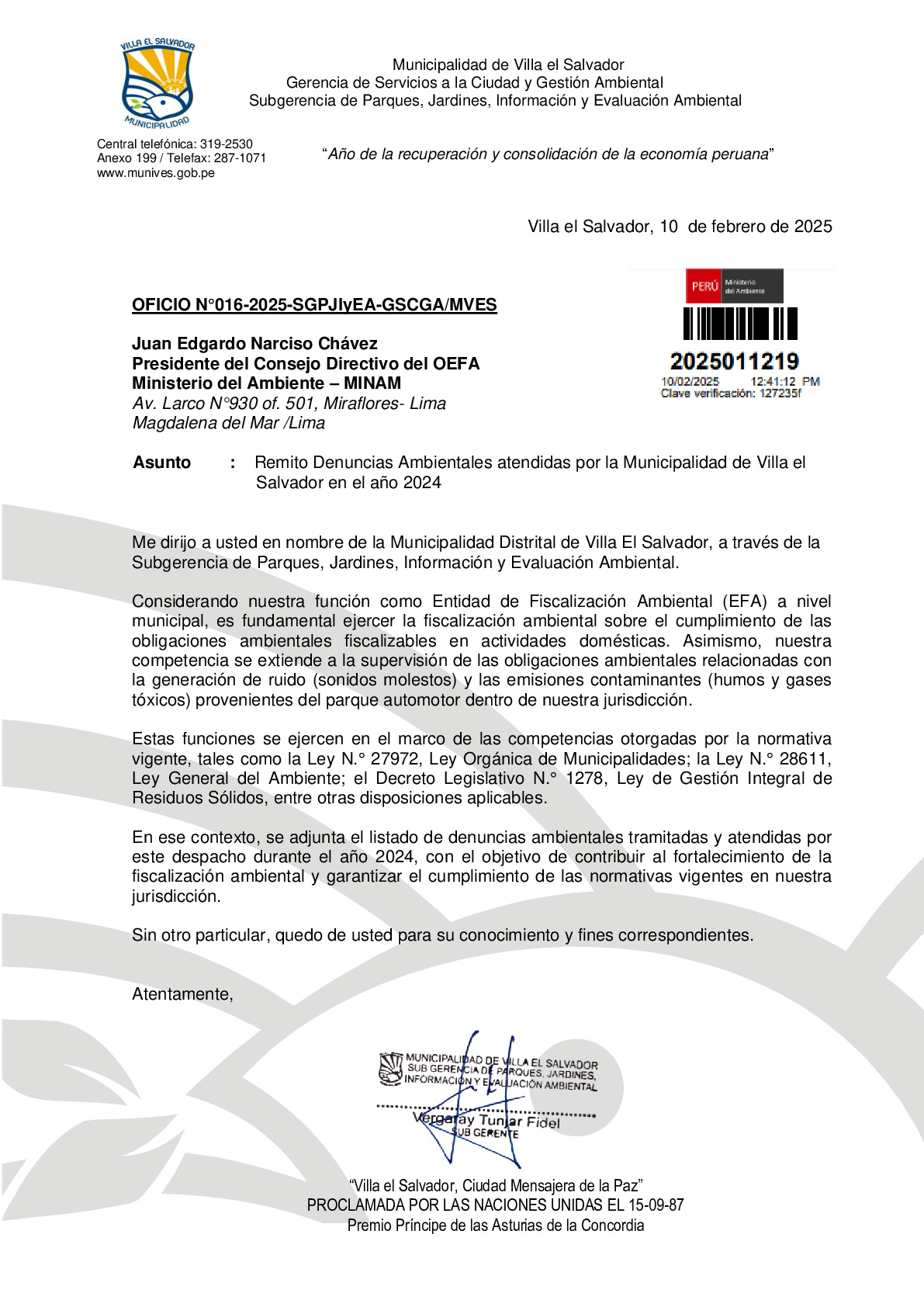 En cumplimiento de lo establecido en el Decreto Legislativo N° 1055 que modifica el artículo 43° de la Ley N° 28611, que indica que "Las entidades deberán enviar anualmente un listado con las denuncias recibidas y soluciones alcanzadas, con la finalidad de hacer pública esta información a la población a través del SINIA".