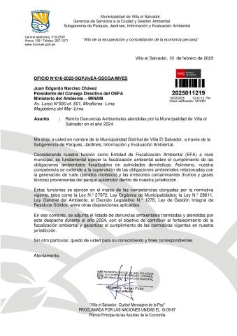 Informe sobre reporte de denuncias ambiental es anuales 2024 Municipalidad Distrital de Villa el Salvador