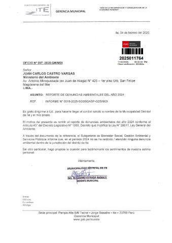 Informe sobre reporte de denuncias ambiental es anuales 2024 Municipalidad Distrital de Ite