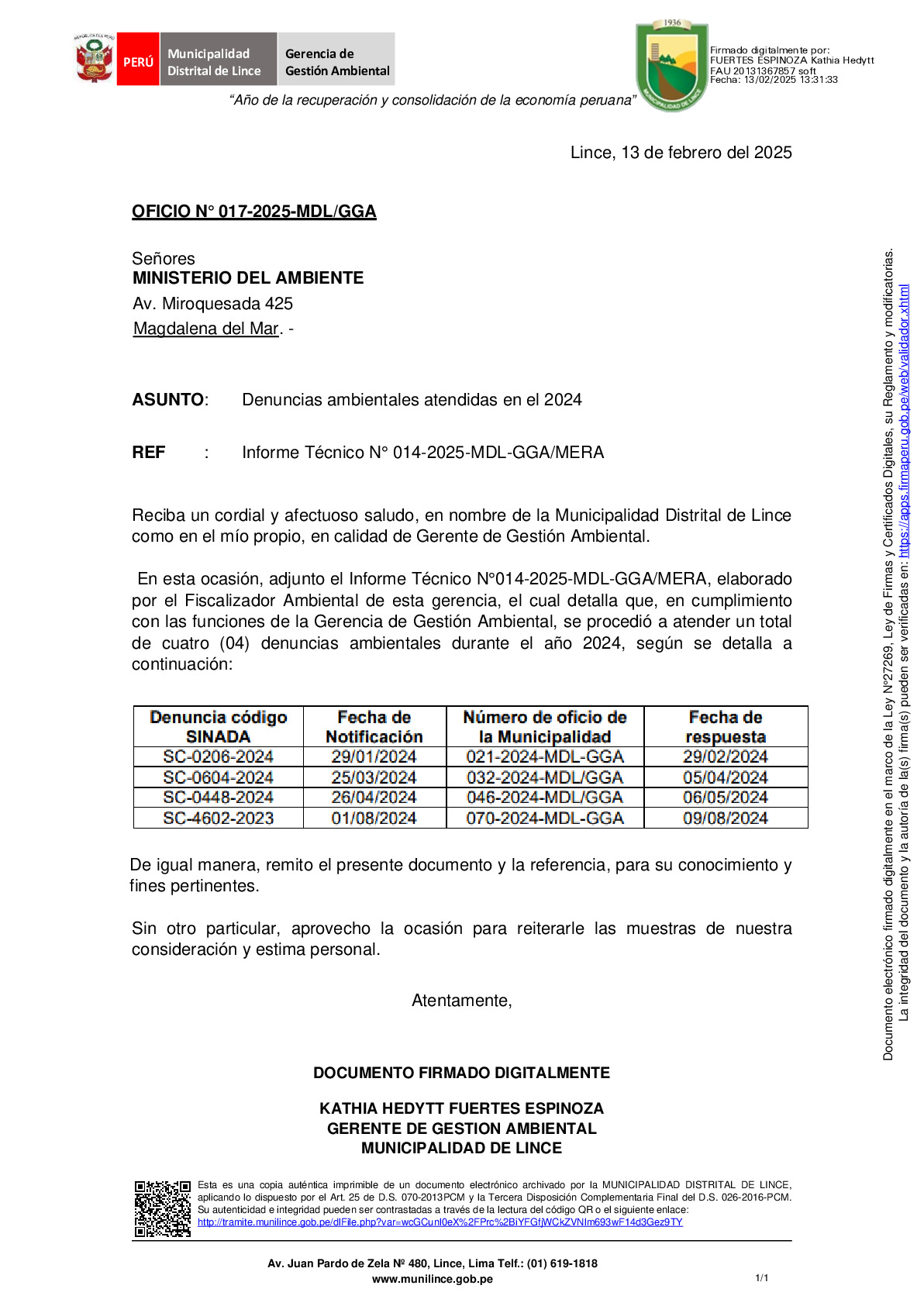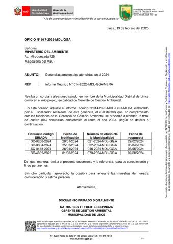 Informe sobre reporte de denuncias ambiental es anuales 2024 Municipalidad Distrital de Lince
