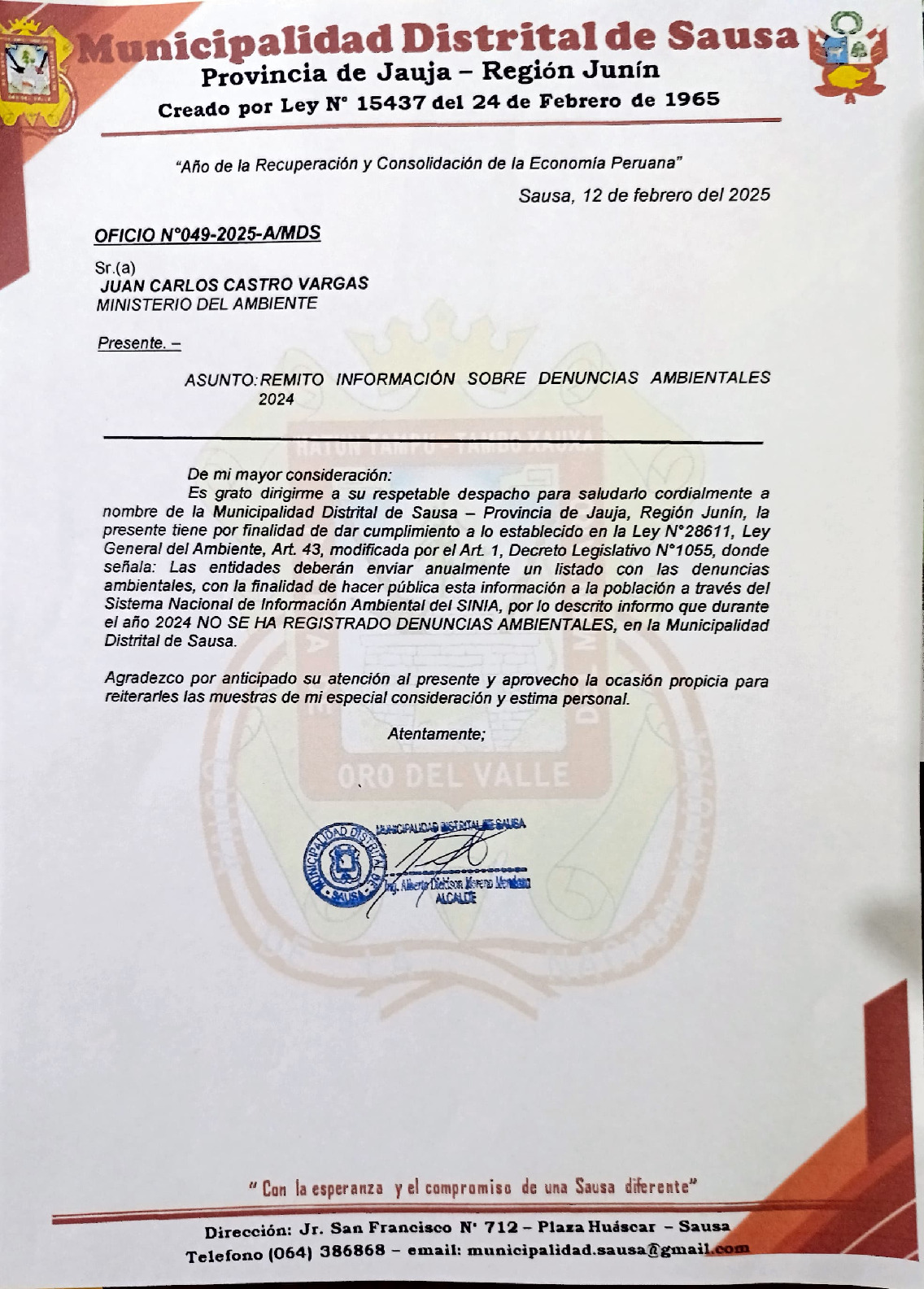 Informe sobre reporte de denuncias ambiental es anuales 2024 Municipalidad Distrital de Sausa