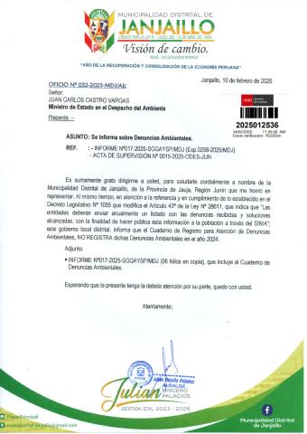 Informe sobre reporte de denuncias ambiental es anuales 2024 Municipalidad Distrital de Janjaillo