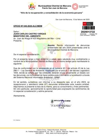 Informe sobre reporte de denuncias ambiental es anuales 2024 Municipalidad Distrital de Marcona