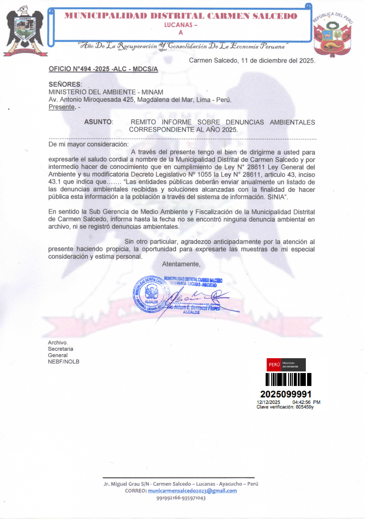 Informe sobre reporte de denuncias ambiental es anuales 2025 Municipalidad Distrital de Carmen Salcedo