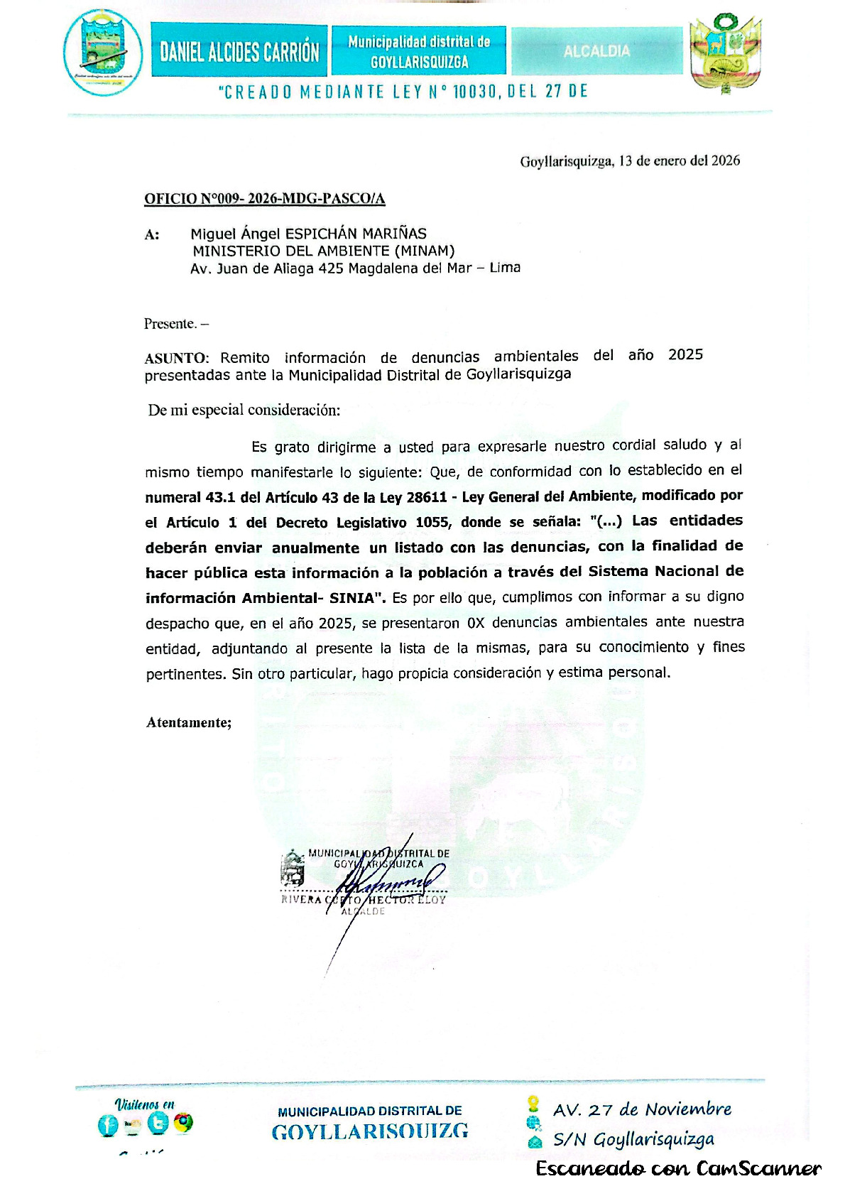 Informe sobre reporte de denuncias ambiental es anuales 2025 Municipalidad Distrital de Goyllariyquizga