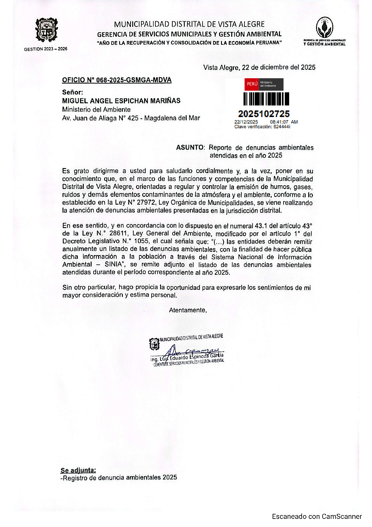 Informe sobre reporte de denuncias ambiental es anuales 2025 Municipalidad Distrital de Vista Alegre