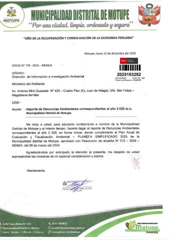 Informe sobre reporte de denuncias ambiental es anuales 2025 Municipalidad Distrital de Motupe