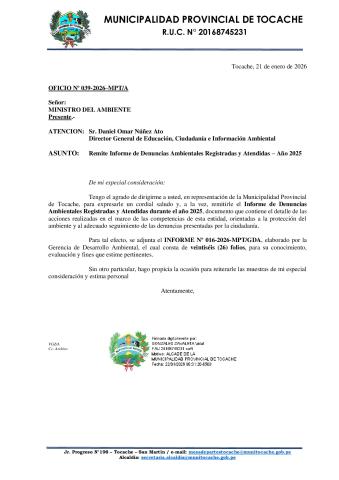 Informe sobre reporte de denuncias ambiental es anuales 2025 Municipalidad Provincial de Tocache