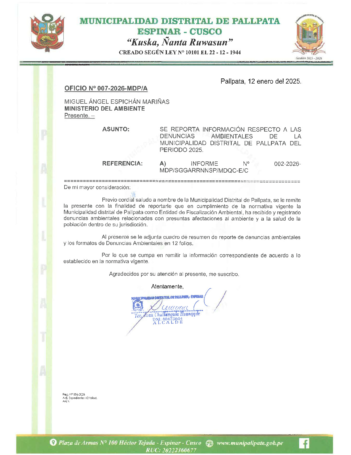 Informe sobre reporte de denuncias ambiental es anuales 2025 Municipalidad Distrital de Pallpata