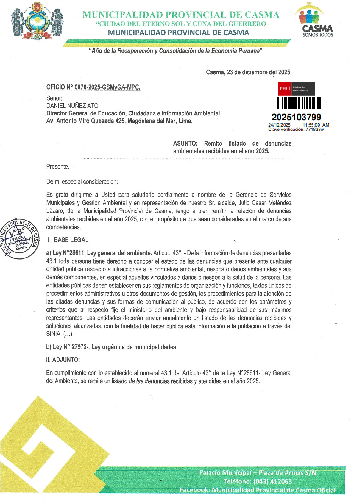 Informe sobre reporte de denuncias ambiental es anuales 2025 Municipalidad Distrital de Casma