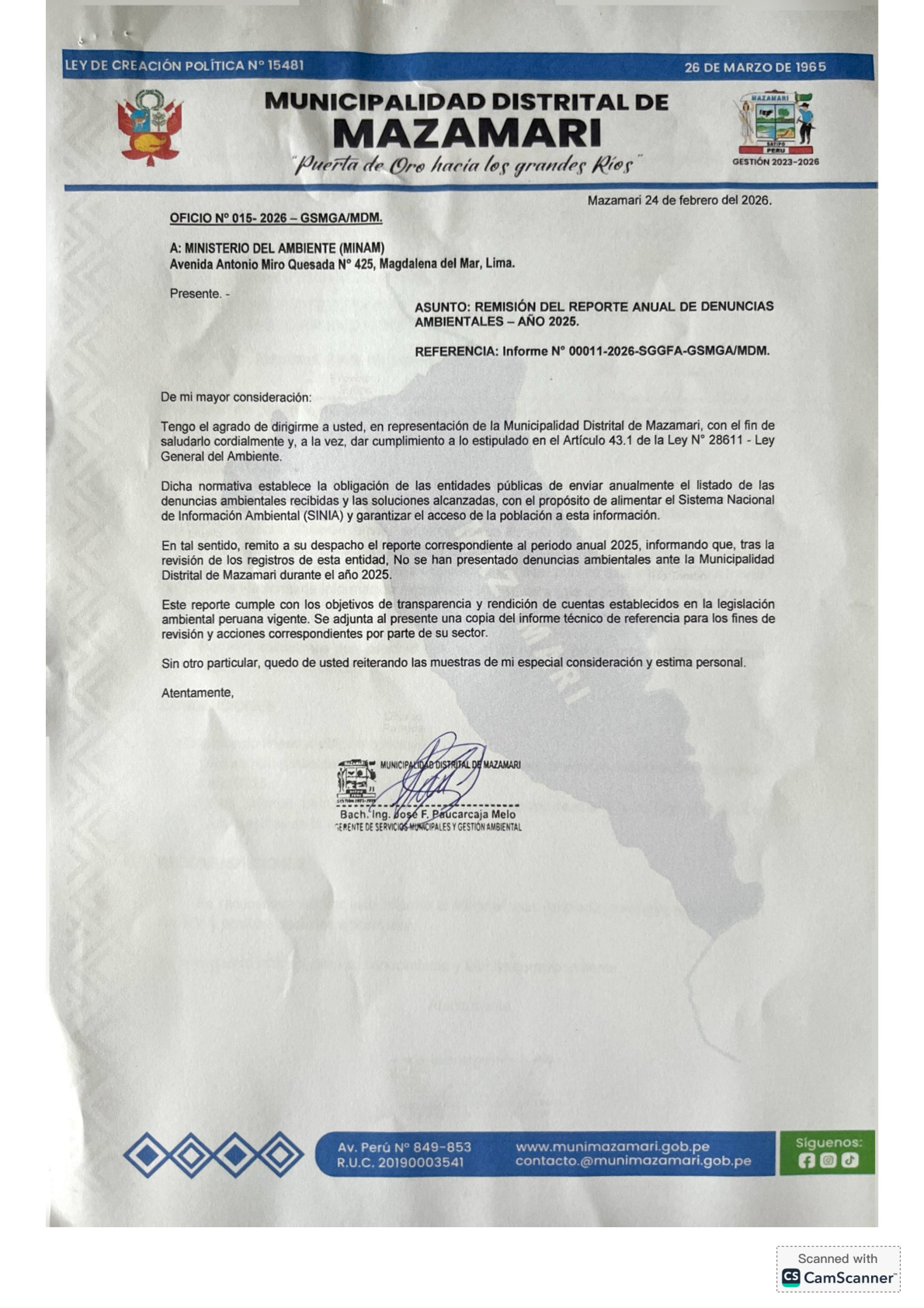 Informe sobre reporte de denuncias ambiental es anuales 2025 Municipalidad Distrital de Mazamari