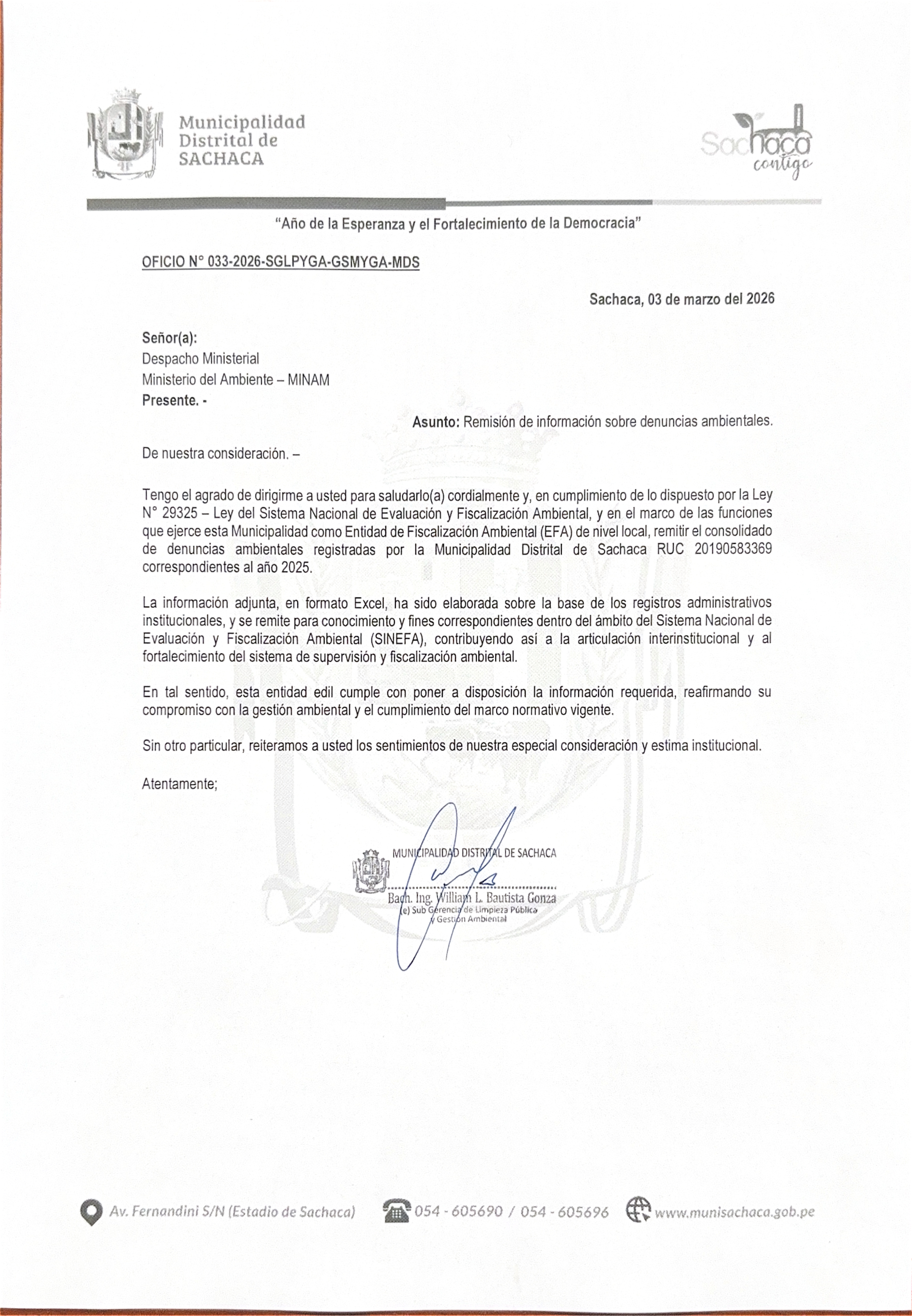 Informe sobre reporte de denuncias ambiental es anuales 2025 Municipalidad Distrital de Sachaca