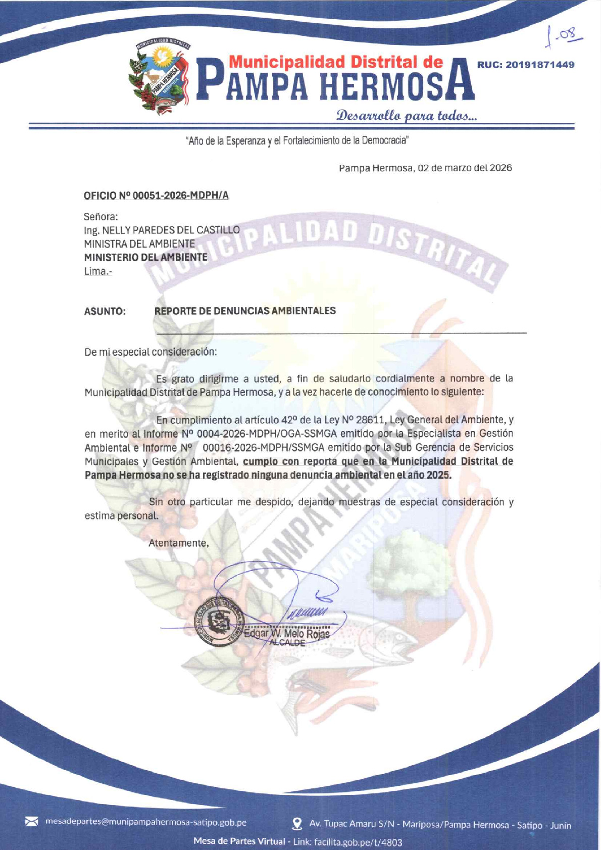 Informe sobre reporte de denuncias ambiental es anuales 2025 Municipalidad Distrital de Pampa Hermosa